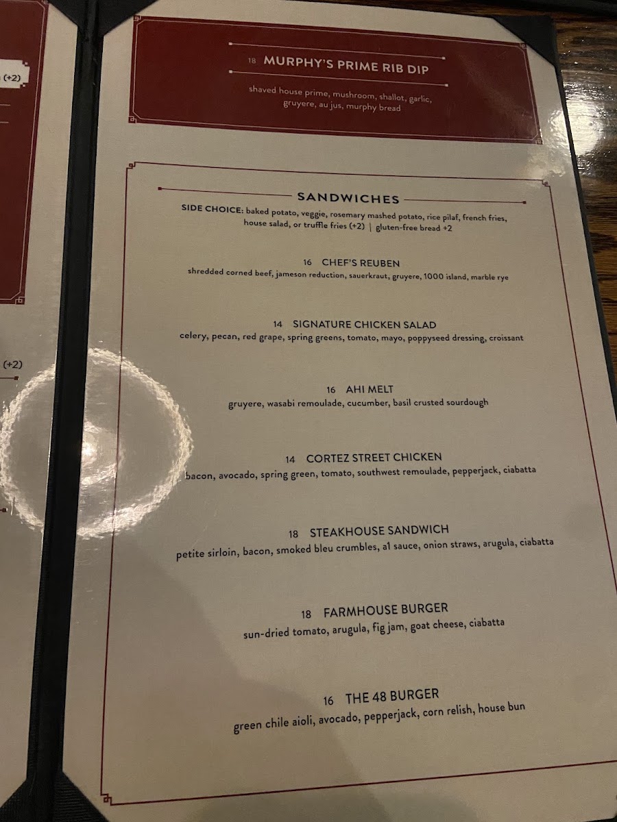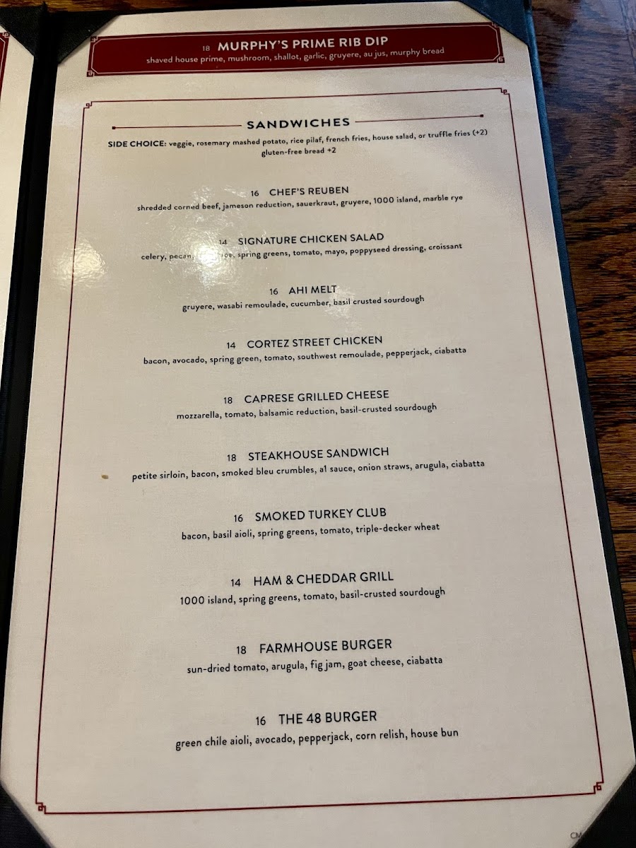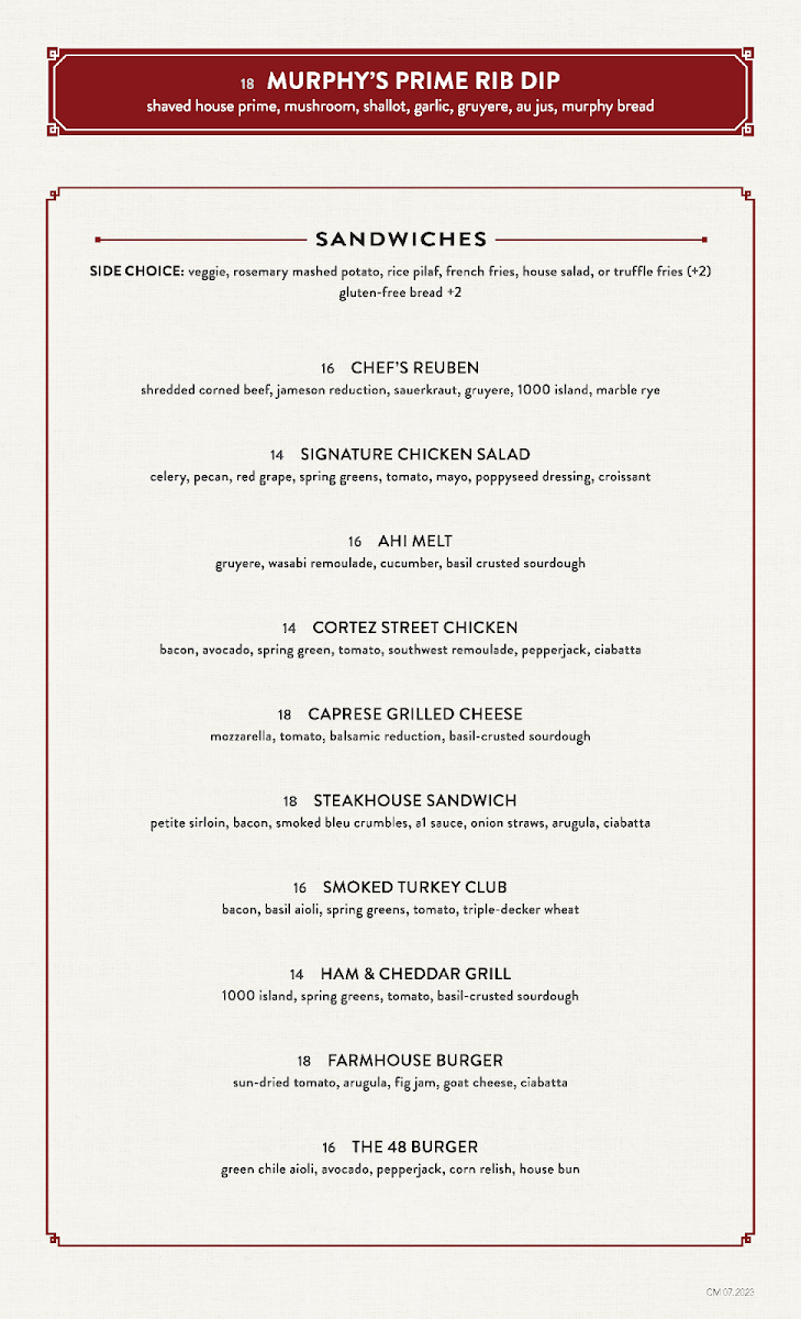 Start your day with comforting soups or a flavorful chicken salad sandwich, perfect for a relaxed brunch or midday break. For dinner, selections like Murphy’s Famous Prime Rib, Filet Mignon, or the Signature Crab Cakes pair well with the warm, classic atmosphere of this historic Prescott landmark. Lighter options like the Pecan Beet Salad or Steak Salad offer fresh, seasonal appeal for those seeking something less hearty but still thoughtfully prepared.