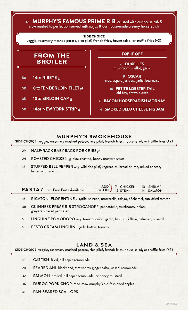 Murphy’s Restaurant offers a thoughtfully crafted menu that balances fine dining with approachable comfort. Whether you’re stopping by for brunch, a casual lunch, or an evening meal, you’ll find a variety of dishes that feel equally satisfying and refined. The menu features classic steakhouse favorites alongside fresh seafood and house-made pastas, creating a versatile dining experience suited to different tastes and occasions.
